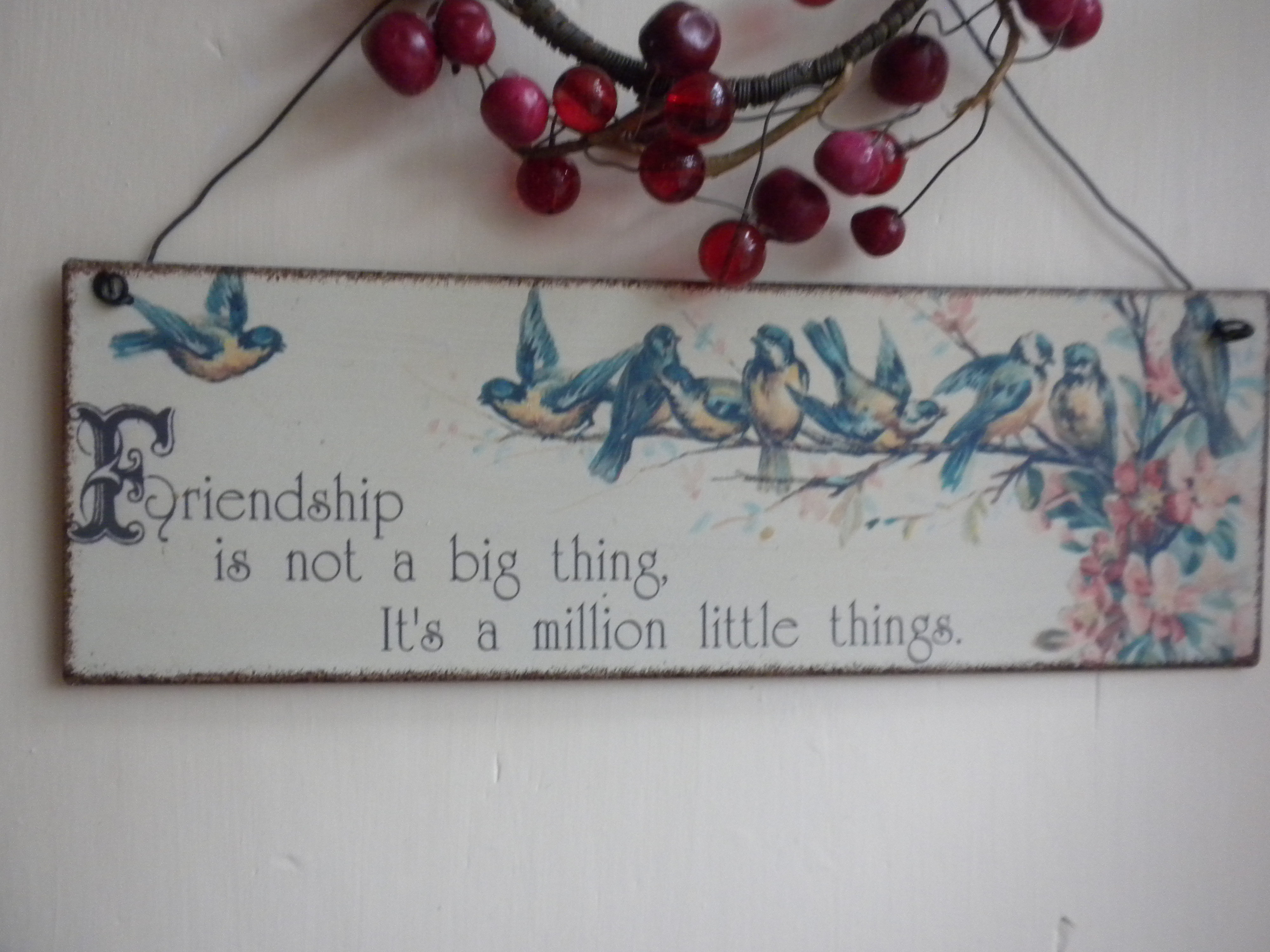 * I wash dishes and read again the small tin sign hanging on the cupboard: “Friendship is not a big thing, It’s a million little things.”