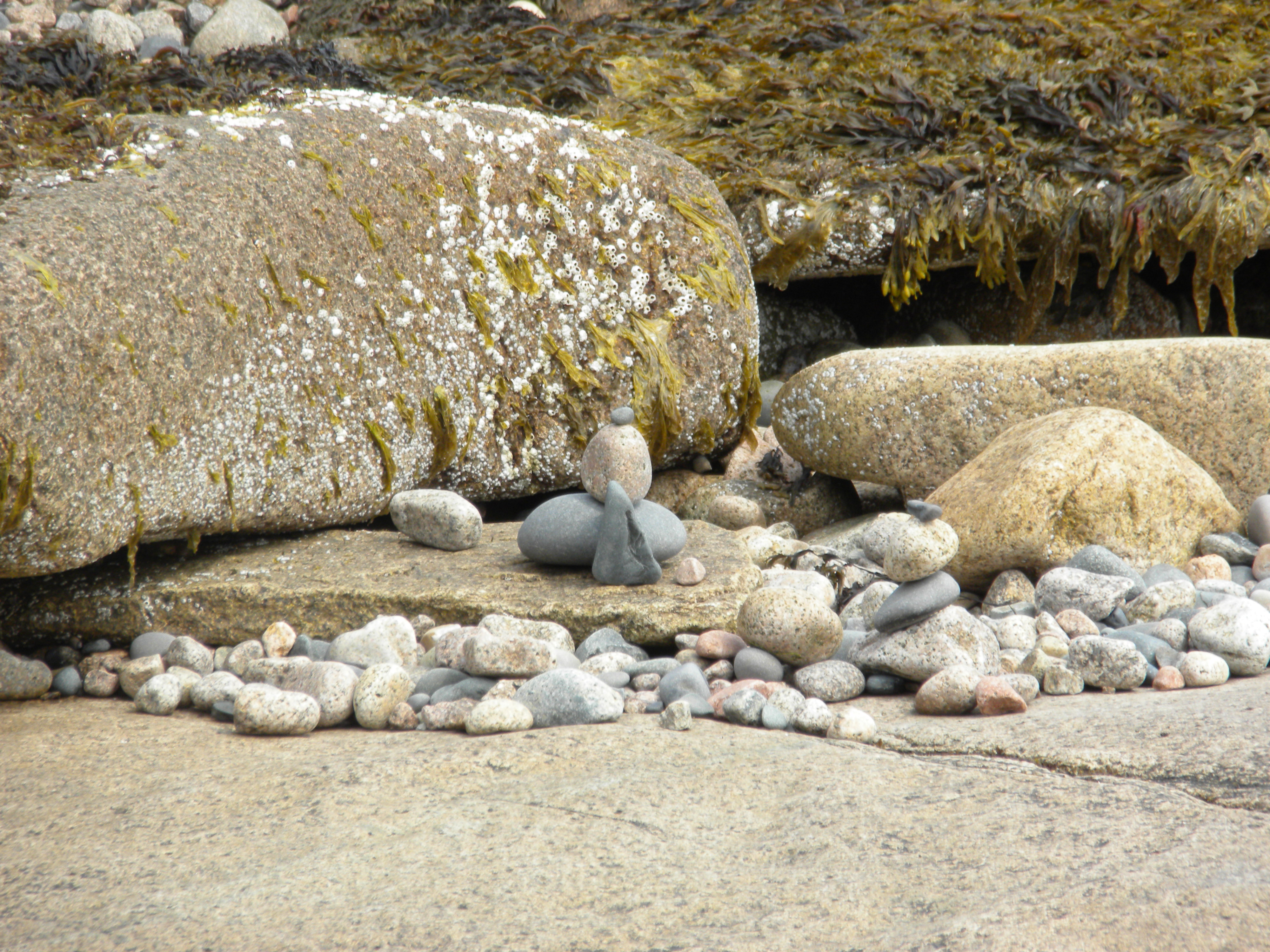 In a cemetery in New England, I watched a woman take a few small, smooth stones from her coat pocket and carefully position them atop a gravestone. That was the first time I saw one of those rock-balancing creations. Now, I notice them many places. In an isolated or otherwise undisturbed place with no one else in sight, we come upon an intriguing stack of stones. Traveling the coast of Maine recently with friends, we left a few of our own: